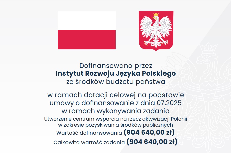Przedsięwzięcie pn. „Utworzenie Centrum Wsparcia na rzecz aktywizacji Polonii w zakresie pozyskiwania środków publicznych” realizowane jest przez Fundację Wolność i Demokracja w ramach naboru pn. „Minigranty. Koncepcja wspierająca strategiczne kierunki działalności Instytutu Rozwoju Języka Polskiego na lata 2025-2030”.