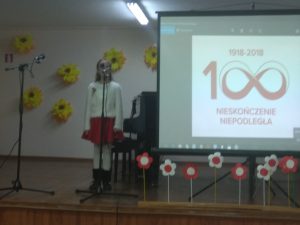 Barbara Burska, prowadząc akademię, często odwoływała się do historii Podola i walk o wolność ojczyzny toczących się na naszych terenach. Zespół wokalny „Głos miłości” zaprezentował wspaniały koncert. Zabrzmiały polskie pieśni „Rota”, „Szara piechota”, „My, pierwsza brygada”, „Jak długo w sercach naszych” , „O mój rozmarynie”, „Biały krzyż”, „Niepodległa”, „Kronika”. Recytacje i pieśni legionowe zostały uatrakcyjnione prezentacjami multimedialnymi: „Świętujemy Niepodległość w rodzinach”, „Józef Piłsudski”, występem pary tanecznej oraz występem tanecznym malutkich dzieci, machających chorągiewkami.