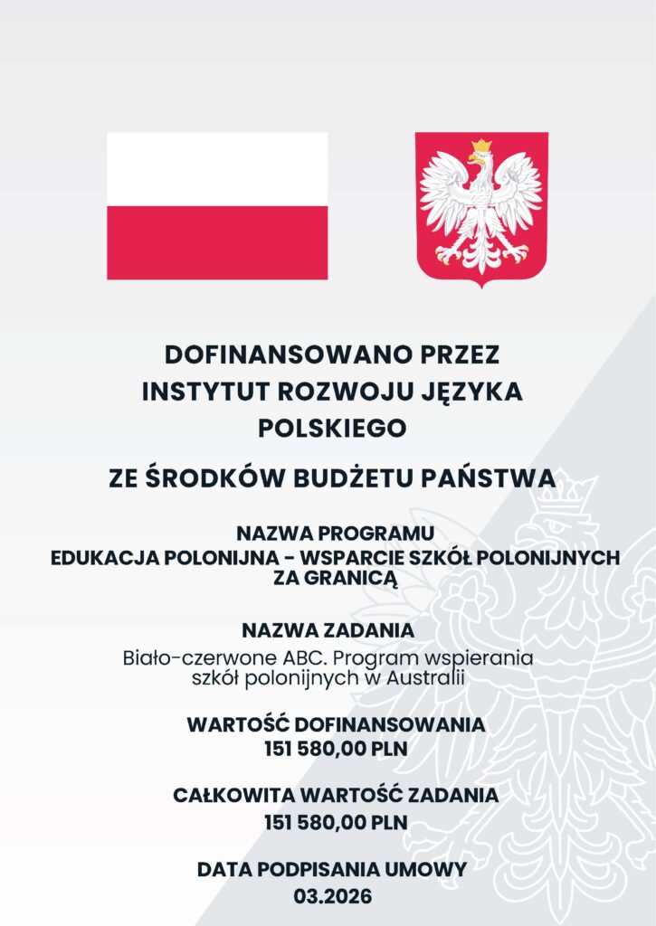 W konkursie “Wspieranie edukacji polonijnej i polskiej poza granicami Polski” zostały przyznane środki na projekt pod nazwą “Biało-czerwone ABC. Wspieranie rozwoju edukacji polskojęzycznej w Australii”.