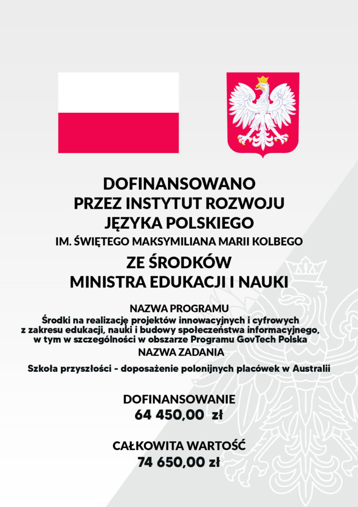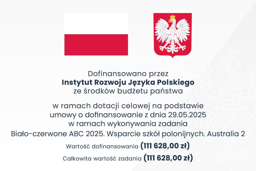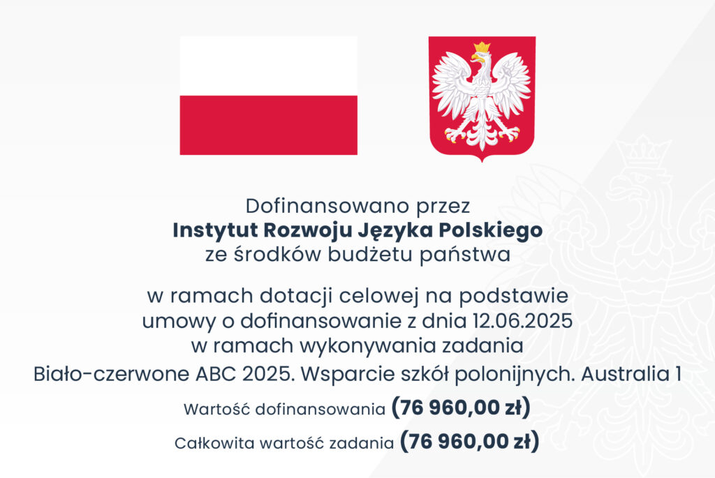 W konkursie “Wspieranie edukacji polonijnej i polskiej poza granicami Polski” zostały przyznane środki na projekt pod nazwą “Biało-czerwone ABC. Wspieranie rozwoju edukacji polskojęzycznej w Australii”.
