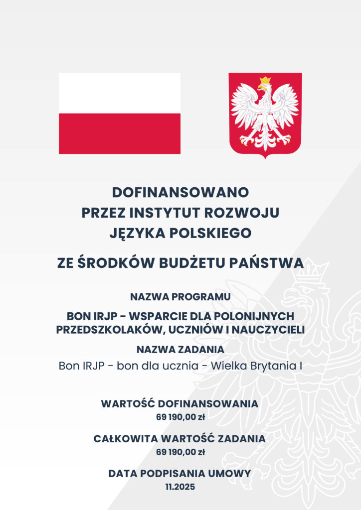 Projekt ma na celu sfinansowanie bonów naukowych i socjalnych dla uczniów uczęszczających do polskich szkół w Wielkiej Brytanii.