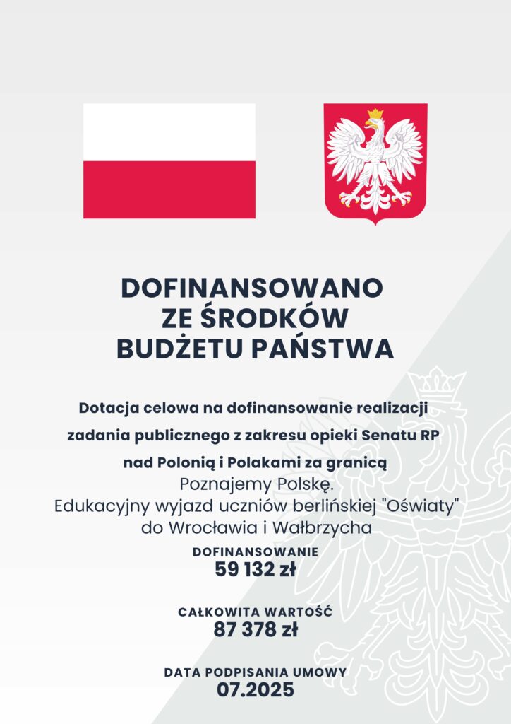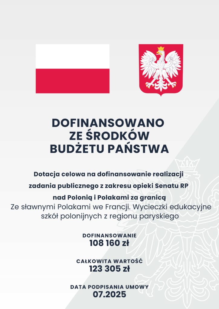 Zadanie publiczne dofinansowane ze środków budżetu państwa w ramach sprawowania opieki Senatu Rzeczypospolitej Polskiej nad Polonią i Polakami za granicą w 2025 roku w ramach konkursu „Senat – Polonia 2025”.