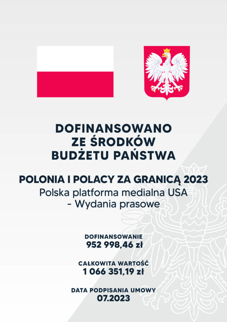 Fundacja Wolność i Demokracja uzyskała z Kancelarii Prezesa Rady Ministrów dofinansowanie na realizację zadania publicznego pt. „Polska Platforma Medialna – USA”. Zadanie realizowane jest w okresie 01.01.2022 r. – 31.12.2022 r. W ramach zadania publicznego wsparciem została objęta Redakcja White Eagle Media, LLC w USA.
