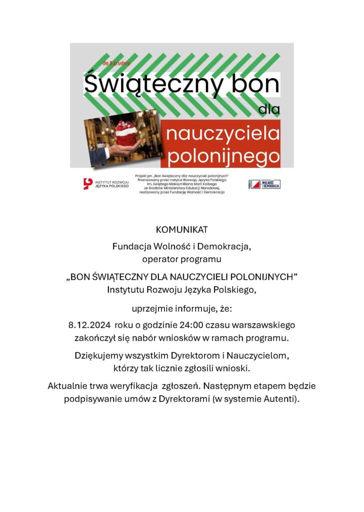 Zgłoszenie dotyczy tych szkół polonijnych, które na bon świąteczny dla nauczycieli jeszcze nie składały wniosku do WiD.