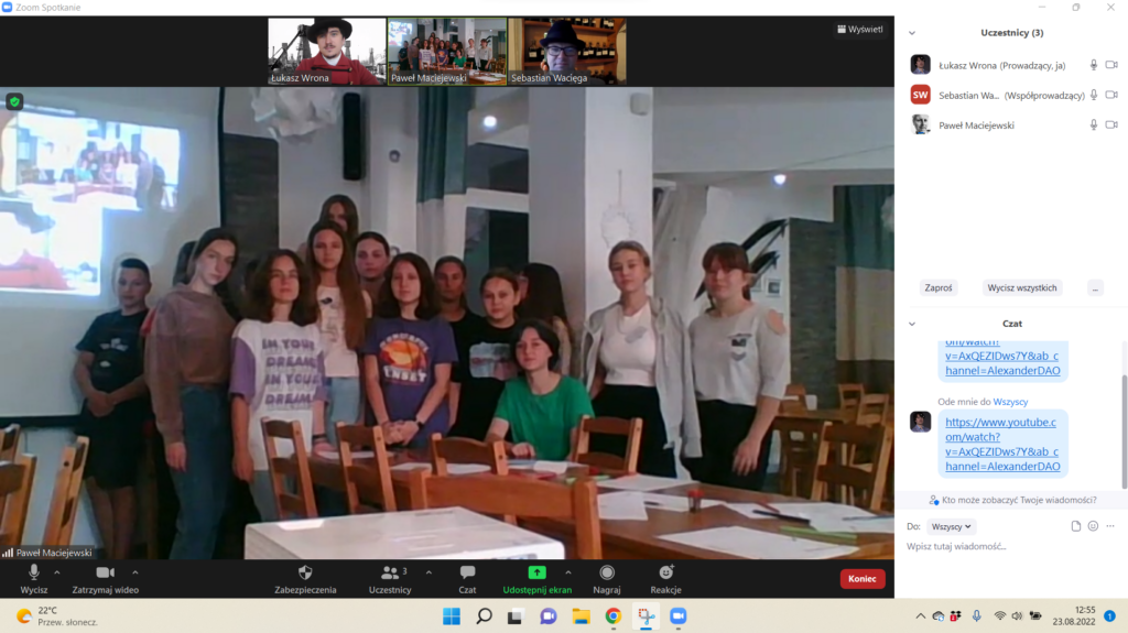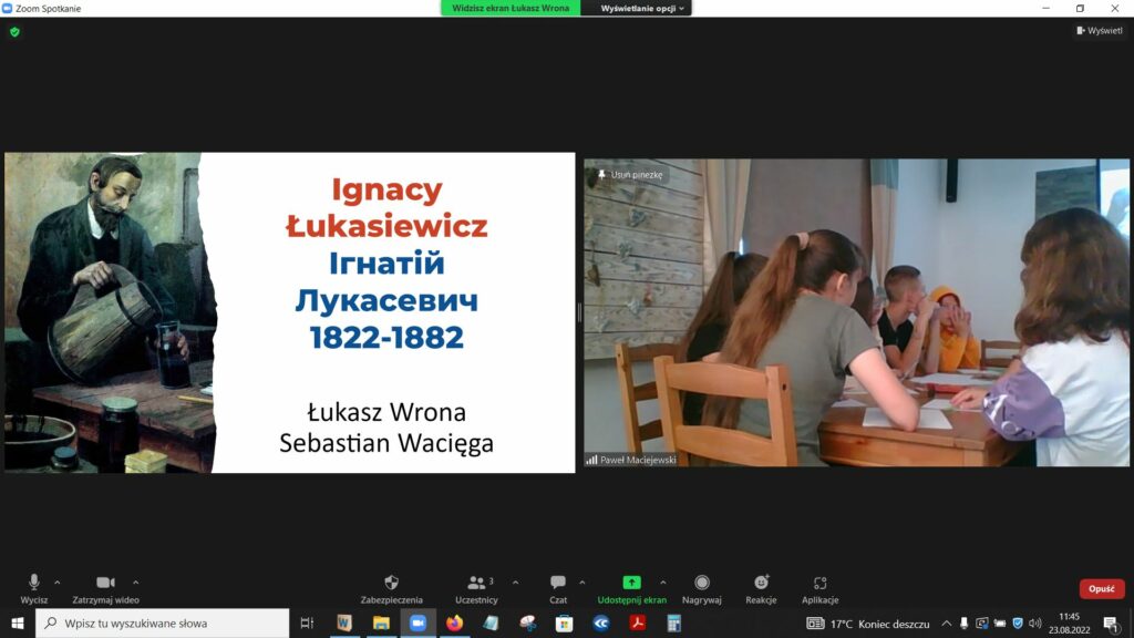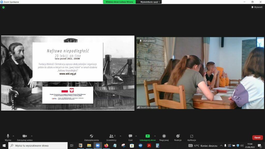 W ramach projektu “Dla Niepodległości – kontynuacja” odbyła się kolejna lekcja z cyklu “Naftowa niepodległość“, dnia 23.08.2022. Projekt finansowany ze środków Kancelarii Prezesa Rady Ministrów w ramach konkursu Polonia i Polacy za Granicą 2022. W lekcji uczestniczyło 20 uczniów z polonijnych organizacji w Żytomierzu i Korosteszowie, którzy połączyły się zdalnie za pośrednictwem ZOOM.