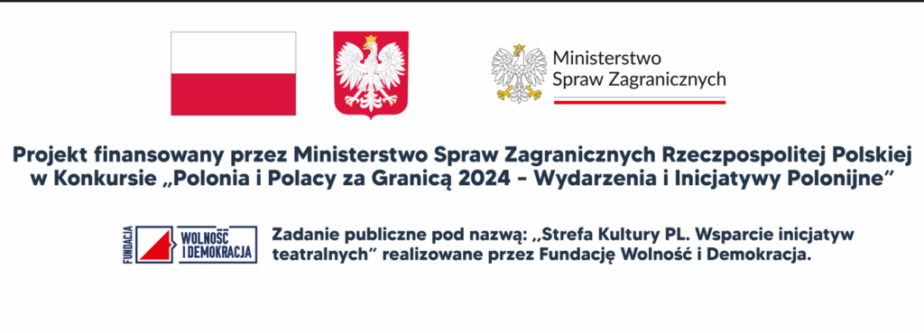 Projekt finansowany przez MSZ RP w ramach konkursu „Polonia i Polacy za granicą 2024 – wydarzenia i inicjatywy polonijne. Zadanie publiczne pod nazwą: „Strefa kultury PL. Wsparcie inicjatyw teatralnych” realizowane przez Fundację Wolność i Demokracja.