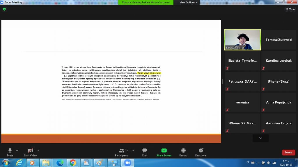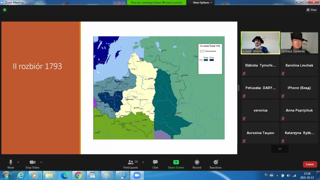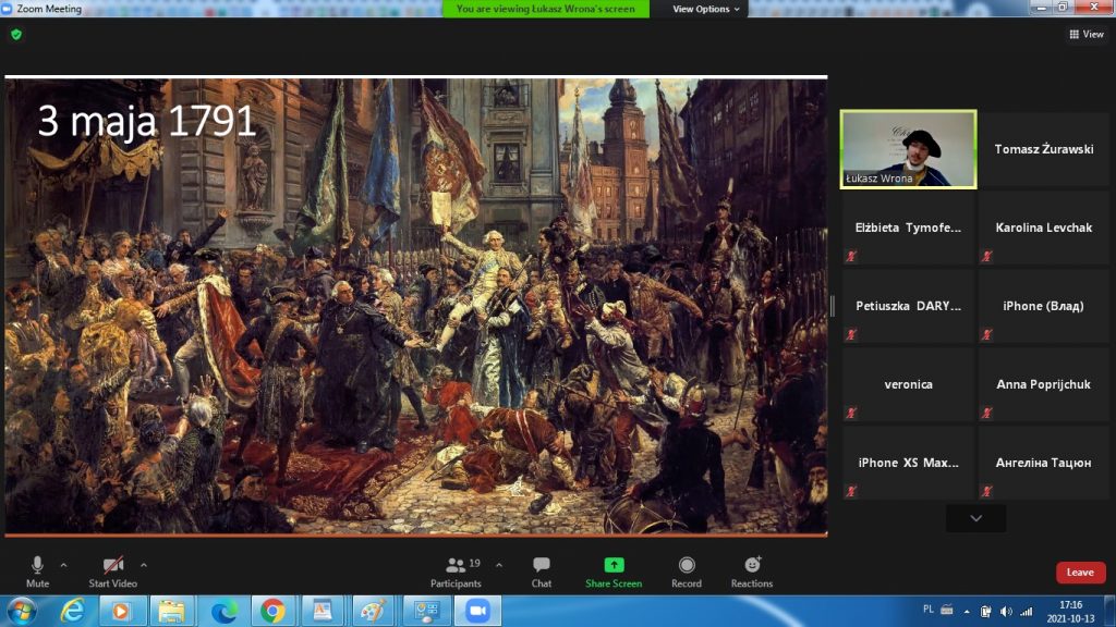 Uczniowie z Ośrodka Kultury i Tradycji Polskich w Żytomierzu i Polskiej Szkoły Sobotnio-Niedzielnej im. ks. prof. J. Tischnera w Użgorodzie 13 października 2021 uczestniczyli w on-line lekcji „żywej historii” z okazji obchodów 230. rocznicy uchwalenia Konstytucji 3 Maja