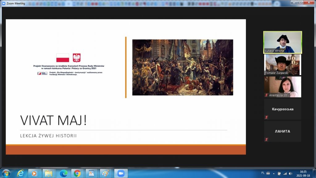 Młodzież ze szkoły sobotnio-niedzielnej przy Związku Polaków na Ukrainie Oddział im. A. Mickiewicza w Odessie i Towarzystwa Polskiej Kultury im. św. Jana Pawła II w Perwomajsku 18 września 2021 uczestniczyła w on-line lekcji VIVAT MAJ z okazji obchodów 230. rocznicy uchwalenia Konstytucji 3 Maja