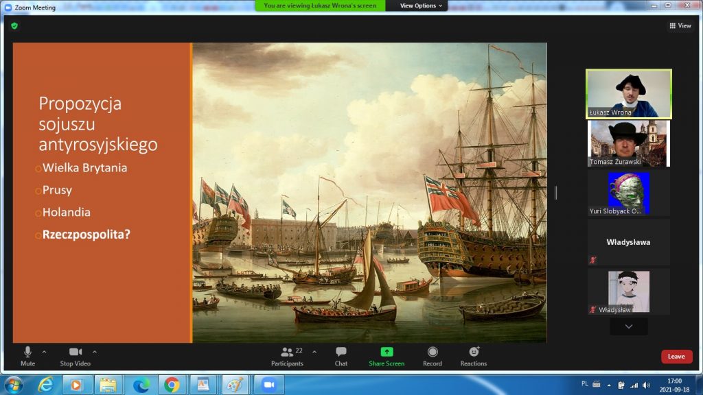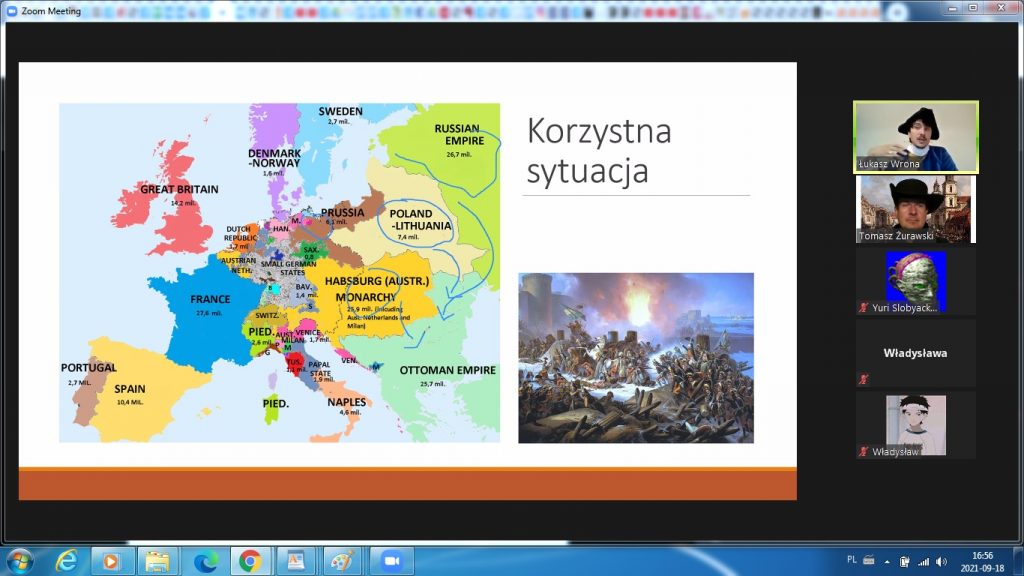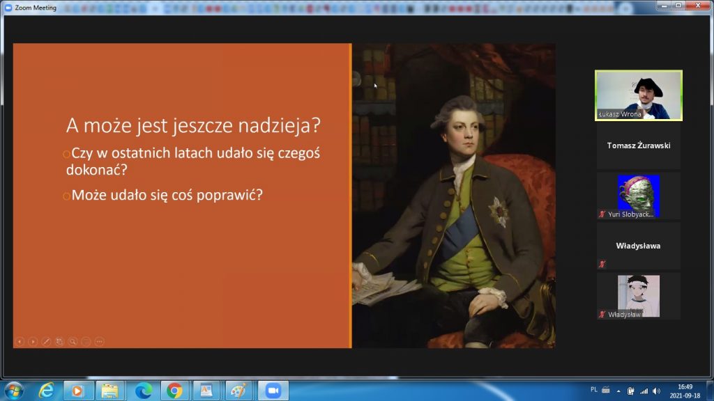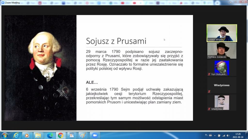 Spotkanie rozpoczęło się od omówienia sytuacji, jaka panowała w Rzeczpospolitej w II połowie XVIII wieku. Wzięło w nim udział 30 uczniów. Uczestnicy wspólnie usiłowali znaleźć odpowiedzi na pytania, jakie wydarzenia i jakie procesy uznać można za pozytywne, jakie zaś za negatywne. Zaznaczony został podział w społeczeństwie na zwolenników szybkich i kompleksowych reform, reform wolnych i rozłożonych w dłuższym czasie oraz przeciwników zmian. Szansa na gruntowne zreformowanie państwa została przedstawiona w kontekście zmieniającej się sytuacji międzynarodowej, nawiązania przez Rzeczpospolitą nowych kontaktów handlowych, a także potencjalnych szans na nowe sojusze wojskowe. Omówione zostały postanowienia Sejmu Wielkiego, poprzedzające uchwalenie Konstytucji, ze szczególnym uwzględnieniem modernizacji armii. Omówienie wad, zalet i perspektyw rozwoju sił zbrojnych ówczesnej rzeczpospolitej wywołało ciekawą dyskusję z uczestnikami spotkania. Następnie zaprezentowane zostały najważniejsze punkty samej Konstytucji oraz ich wpływ na sytuację w Rzeczpospolitej. Ostatnią część spotkania stanowiła dyskusja na temat możliwości zbrojnej obrony reform wprowadzonych w Rzeczpospolitej – wspólnie z uczestnikami podjęta została dyskusja, jakie atuty posiadała Armia Koronna, a jakich ważnych czynników zabrakło podczas wojny 1792 roku. Zajęcia poprowadził Łukasz Wrona i Tomasz Żurawski.