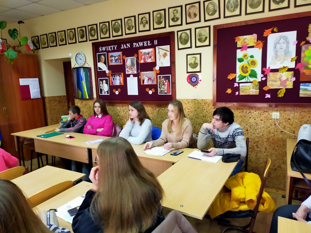 Następnie nastąpił główny punkt spotkania: uczestnicy odpowiadali na pytania dotyczące Karola Wojtyły i Jana Pawła II. Pytania dotyczyły życia, rodziny, awansowania w hierarchii kościelnej, encyklik, poematów, dramatów oraz zainteresowań i pasji naszego wielkiego rodaka. Zdecydowanie zwyciężyła Diana Nawrocka, drugie miejsce zajęła Anhelina Piweń (obydwie uczennice grupy III) a trzecie Waleria Bogdan – uczennica grupy II. Zdobywczynie pierwszych trzech miejsc otrzymały nagrody i dyplomy, natomiast pozostali uczestnicy upominki, książki oraz dyplomy za udział i aktywność.