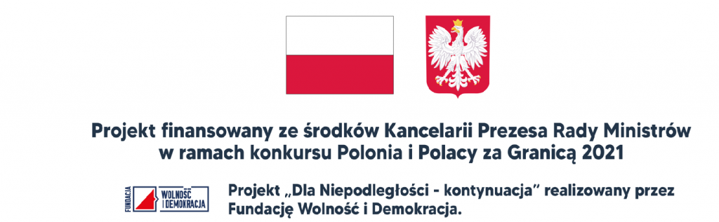 Projekt „Dla Niepodległości – kontynuacja” jest realizowany przez Fundację Wolność i Demokracja, wspierany ze środków Kancelarii Prezesa Rady Ministrów w ramach konkursu Polonia i Polacy za granicą 2021.
