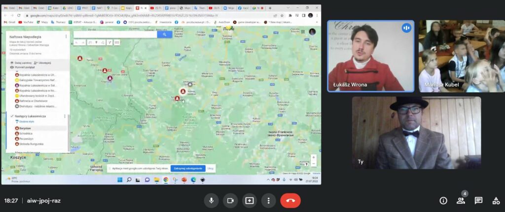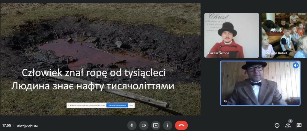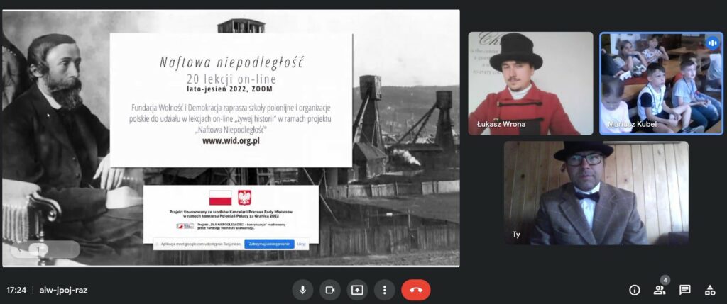 W ramach projektu “Dla Niepodległości – kontynuacja” odbyła się kolejna lekcja z cyklu “Naftowa niepodległość“, dnia 27.07.2022. Projekt finansowany ze środków Kancelarii Prezesa Rady Ministrów w ramach konkursu Polonia i Polacy za Granicą 2022. W lekcji uczestniczyło 16 uczniów z dwóch zagranicznych organizacji polonijnych. Zgromadziła się młodzież z ośrodka Kultury i Tradycji Polskich w Żytomierzu i z Stowarzyszenia Polaków z Mikołajowa. Słuchacze połączyli się zdalnie za pośrednictwem platformy ZOOM.