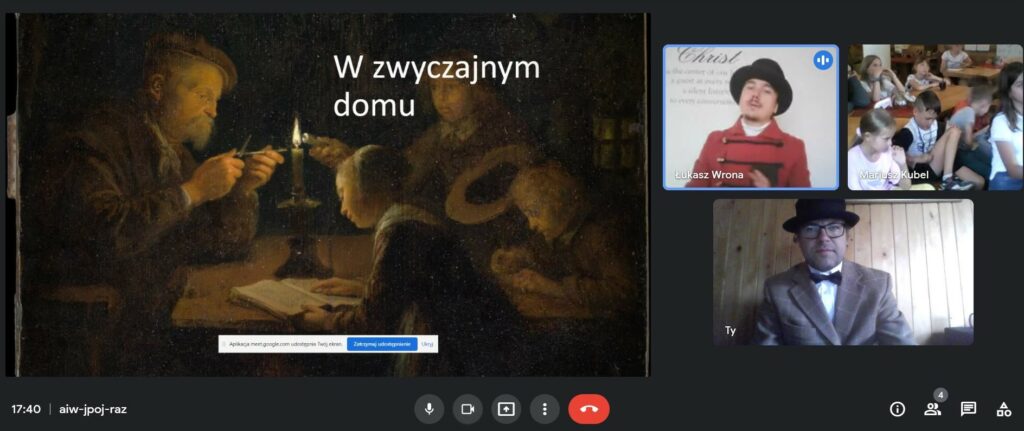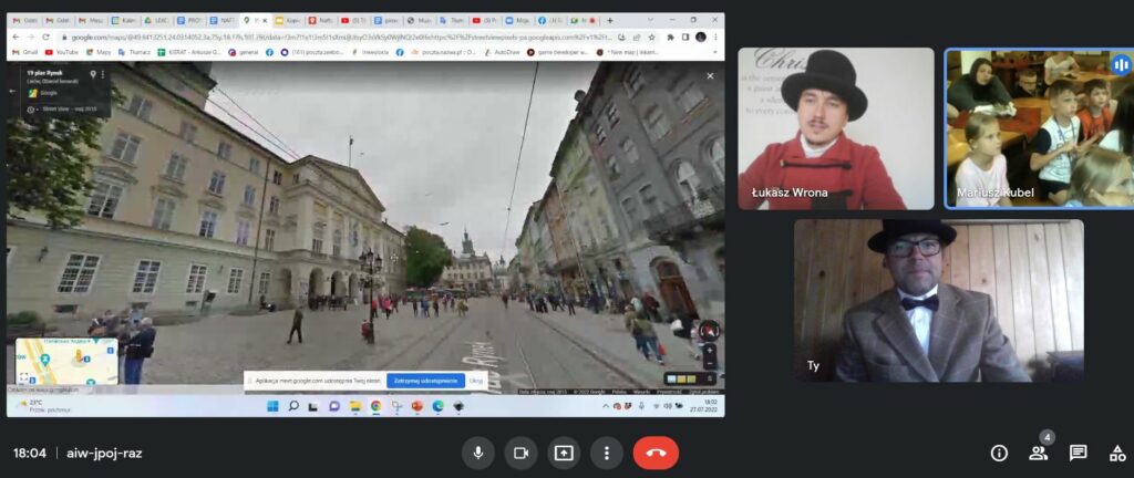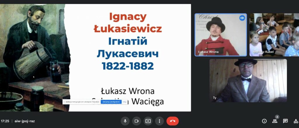 Lekcja rozpoczęła się od przedstawienia się i powitania uczestników. Omówiono założenia projektu oraz powód realizacji lekcji – 200. rocznice urodzin Ignacego Łukasiewicza. Przy okazji zebraliśmy informacje dotyczące rozpoznawalności tej postaci wśród społeczności polskiej na Ukrainie. Do realizacji wybrany został scenariusz dla młodszych, w którym skupiliśmy się na problemie światła – tego jak ludzie radzili sobie z jego brakiem, oraz jak wielkiego odkrycia w tej dziedzinie dokonał polski wynalazca. Kilkukrotnie podczas lekcji korzystaliśmy z metody burzy mózgów. Zadawaliśmy pytania dotyczące m.in. wyzwań człowieka pierwotnego, który nie ujarzmił jeszcze ognia, sposobów wykorzystywania ognia oraz wad pierwotnych nośników światła (np. świec). Metodę tą wspierały wyświetlane grafiki, w tym obrazy przedstawiające np. wnętrza dawnych domów oświetlane pojedynczymi świecami. W drugiej części lekcji przedstawiliśmy postać Ignacego Łukasiewicza. Jego losy omawialiśmy z wykorzystaniem dwóch narzędzi Google – Map oraz Google Street View. Uczestnicy byli bardzo aktywni i udzielali interesujących odpowiedzi. Celnie podsumowywali kolejne części prezentacji (np. dotyczące zasług Łukasiewicza i jego lampy). Po wspólnym odśpiewaniu naftowej pieśni porozmawialiśmy o znaczeniu Łukasiewicza w XXI wieku i jego roli dla rozwoju motoryzacji.