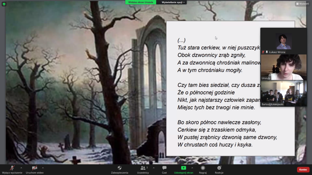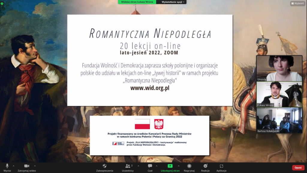 W ramach projektu “Dla Niepodległości – kontynuacja” odbyła się kolejna lekcja z cyklu “Romantyczna Niepodległa“, dnia 25.07.2022. Projekt finansowany ze środków Kancelarii Prezesa Rady Ministrów w ramach konkursu Polonia i Polacy za Granicą 2022. W lekcji uczestniczyło 21 uczniów z dwóch organizacji polonijnych z Ukrainie. Zgromadziła się młodzież z obwodowej organizacji społecznej “Studencki Klub Polski” i z szkoły sobotnio – niedzielnej im. Jana Pawła II przy Towarzystwie Kultury Polskiej Ziemi Lwowskiej (oddział w Czerwonogradzie). Słuchacze połączyli się zdalnie za pośrednictwem platformy ZOOM.