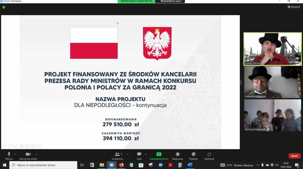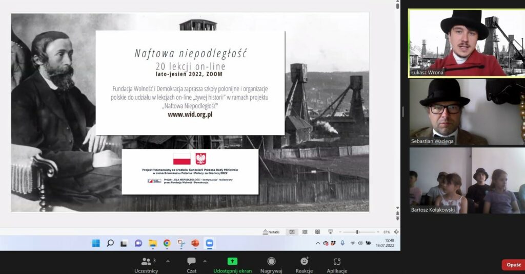 W ramach projektu “Dla Niepodległości – kontynuacja” odbyła się kolejna lekcja z cyklu “Naftowa niepodległość”, dnia 19.07.2022. Projekt finansowany ze środków Kancelarii Prezesa Rady Ministrów w ramach konkursu Polonia i Polacy za Granicą 2022. W lekcji uczestniczyło 21 uczniów z dwóch organizacji polonijnych z Ukrainie. Zgromadziła się młodzież z obwodowej organizacji społecznej “Studencki Klub Polski” i z szkoły sobotnio – niedzielnej im. Jana Pawła II przy Towarzystwie Kultury Polskiej Ziemi Lwowskiej (oddział w Czerwonogradzie). Słuchacze połączyli się zdalnie za pośrednictwem platformy ZOOM.