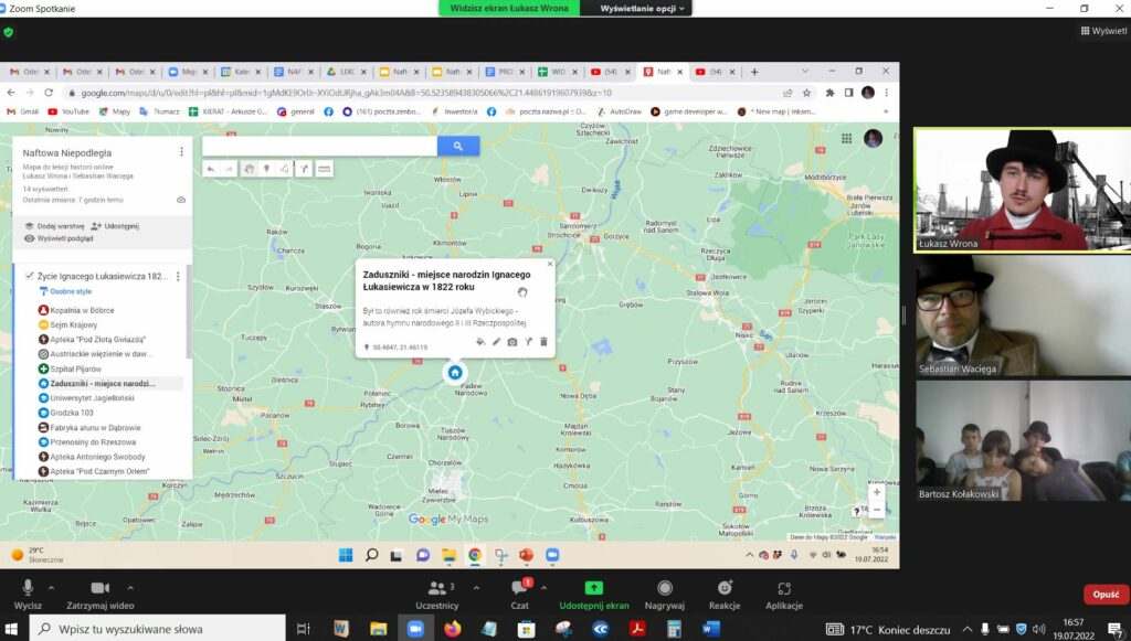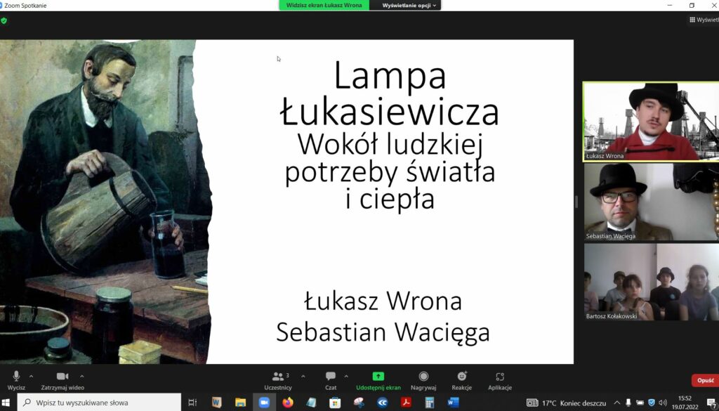 Lekcja poświęcona była wpływowi Łukasiewicza i jego następców na rozwój ziem polskich (a zwłaszcza Galicji) w XIX wieku. Aby temat był lepiej przyswojony przez młodych odbiorców odwoływaliśmy się do naturalnych i oczywistych potrzeb każdego człowieka – światła i ciepła. Korzystając z metody burzy mózgów prowadziliśmy rozmowę z uczestnikami na temat tego, z jakimi problemami mierzył się człowiek pierwotny przed opanowaniem umiejętności podtrzymywania i krzesania ognia. Ta sama metoda posłużyła nam w trakcie dyskusji o wadach świec (najpowszechniejszego nośnika światła do XIX wieku) oraz roli aptek w wielkich odkryciach epoki przemysłowej. Opierając się na stworzonej Mapie Google zaprezentowaliśmy sylwetkę Ignacego Łukasiewicza, związanego z miejscami znajdującymi się dziś zarówno na terenie Polski, jak i Ukrainy. Korzystając z możliwości rysowania w aplikacji ZOOM szkicowaliśmy zalety skonstruowanej przez niego lampy naftowej. Jego praca w pierwszej na świecie kopalni ropy naftowej zilustrowana została fragmentem filmu “Aż poleje się krew”. Spotkanie zakończyliśmy podsumowaniem dotyczącym tego, co w XXI wieku zawdzięczamy pracy Łukasiewicza. Uczestnicy bez problemu wskazali, że chodzi o naftę jako paliwo napędowe samochodów.