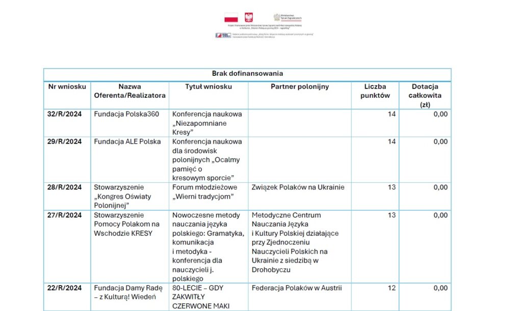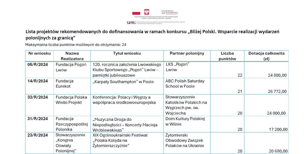 Konkurs realizowany jest ze środków Państwa Polskiego – Ministerstwa Spraw Zagranicznych w ramach Konkursu „Polonia i Polacy za granicą 2024 – regranting”