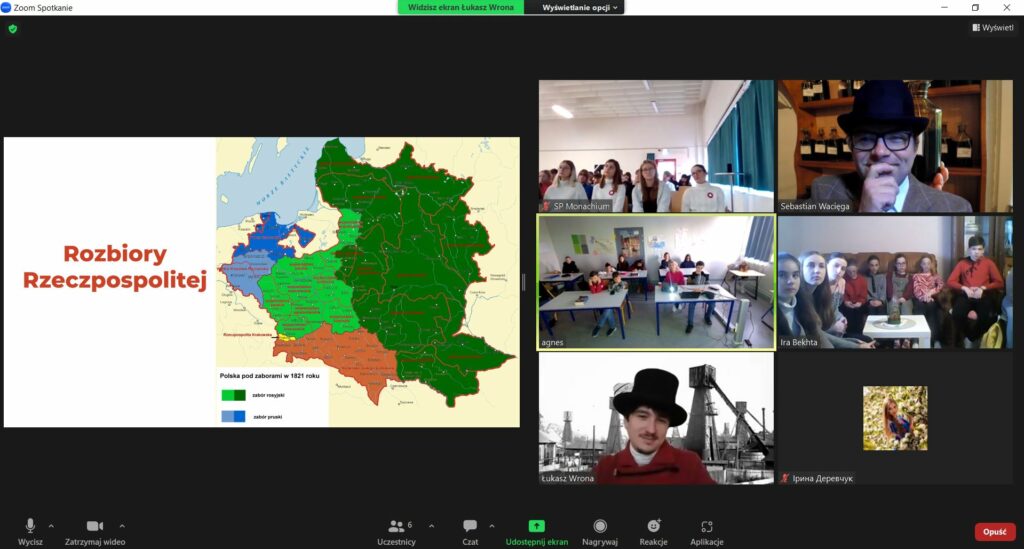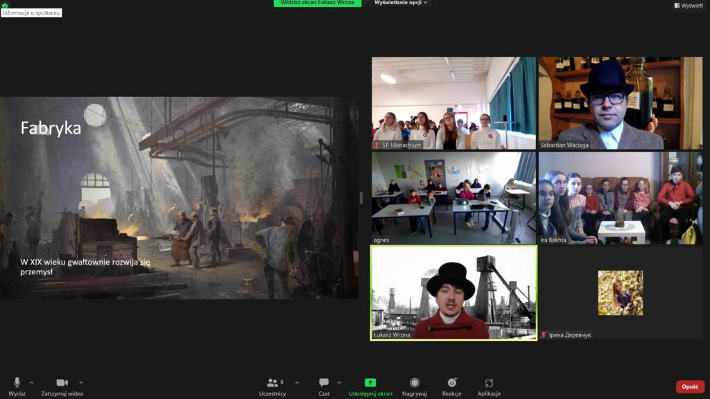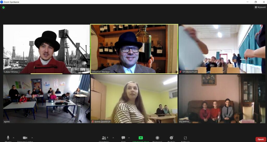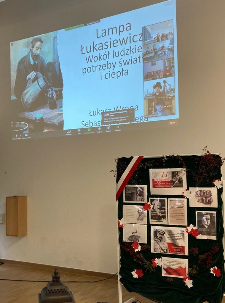 W pierwszej części lekcji lektorzy przedstawili uczestnikom cel spotkania i tegoroczną rocznicę, która jest pretekstem do poznania postaci Łukasiewicza. Zaprezentowana została nazwa projektu, jego organizator oraz źródło dofinansowania. Następnie przeprowadzona została burza mózgów poświęcona dawnym zastosowaniom ognia, w tym przede wszystkim oświetlaniu. Następnie zaś młodzież odkrywała kolejne kroki milowe w historii ludzkich wynalazków – pochodnie, lampy oliwne, świece. Przeprowadzona została również dyskusja na temat wad i zalet tych ostatnich. Na bazie tych informacji wprowadzona została postać Ignacego Łukasiewicza, który zastąpił świece lampami naftowymi. Korzystając z możliwości tworzenia notatek na żywo w programie ZOOM, omówiony został i wskazany każdy element lampy naftowej. Uczestnicy starali się określić zastosowanie kolejnych części. Szczegółowo omówiony został także rozwój galicyjskiego przemysłu naftowego. Dzięki korzystaniu z przygotowanej Mapy Google z lokacjami wskazane zostały miejscowości mające ogromne znaczenie dla historii polskiego i ukraińskiego nafciarstwa. Uczestnicy byli bardzo aktywni i mieli interesujące przemyślenia dotyczące roli przemysłu naftowego w XIX wieku. W trakcie lekcji prezentowany był fragment filmu fabularnego “Aż poleje się krew”, jako ilustracja działania wiertnicy kanadyjskiej. Sporo miejsca przeznaczono na omówienie filantropijnej pracy Łukasiewicza i wpływu jego działań na rozwój Galicji. Na zakończenie wspólnie z uczestnikami zaśpiewaliśmy jedną z pieśni borysławskich nafciarzy z początku XX wieku.
