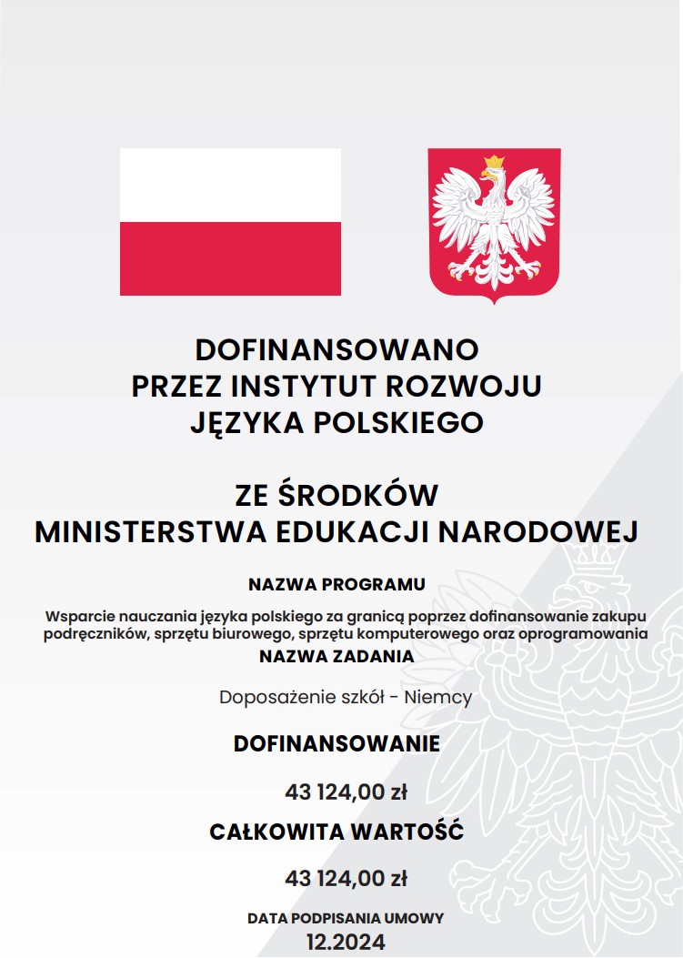 W konkursie Wspieranie edukacji polonijnej i polskiej poza granicami Polski zostały przyznane środki na projekt pod nazwą: Biało-czerwone ABC. Wspieranie rozwoju edukacji polskojęzycznej w Niemczech.