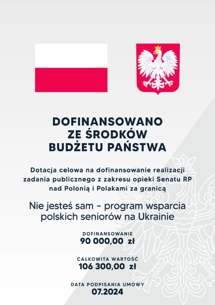 Fundacja Wolność i Demokracja w ramach konkursu „Senat-Polonia 2024” ogłoszonego przez Kancelarię Senatu w roku 2024 zrealizowała zadanie publiczne pod nazwą: „Nie jesteś sam – program wsparcia polskich seniorów na Ukrainie”.