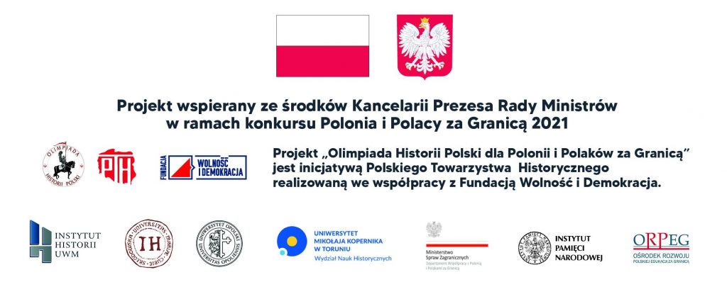 Olimpiada Historii Polski dla Polonii i Polaków za granicą jest inicjatywą Polskiego Towarzystwa Historycznego realizowaną we współpracy Fundacji Wolność i Demokracja. Projekt wspierany ze środków Kancelarii Prezesa Rady Ministrów w ramach konkursu Polonia i Polacy za Granicą 2021.