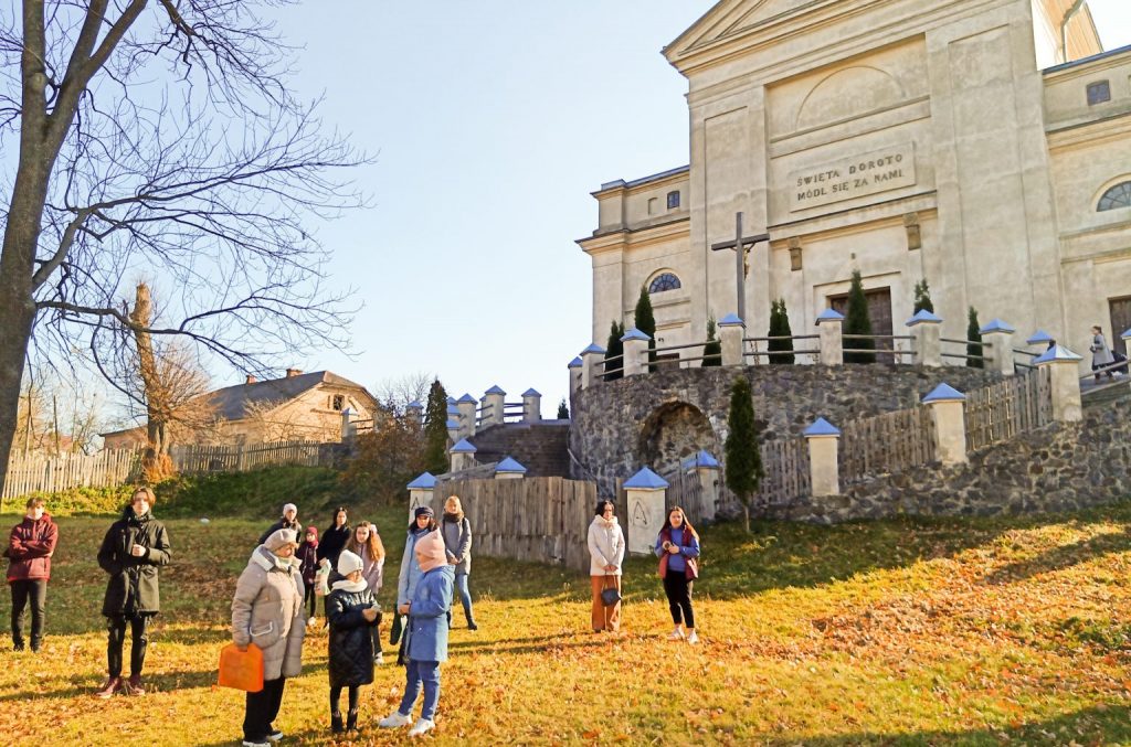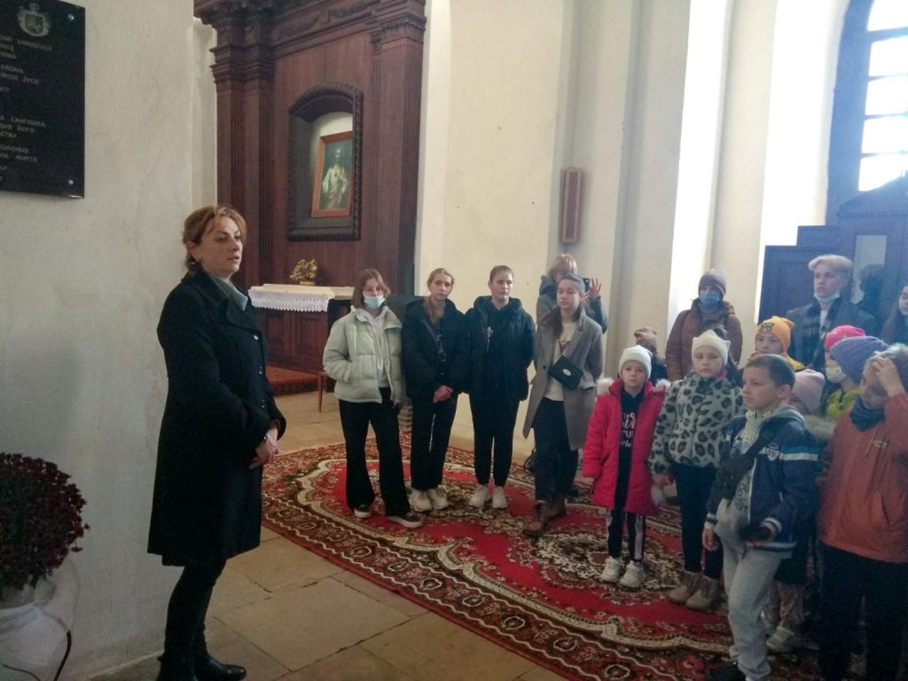 Naszą wycieczkę zaczęliśmy od kościoła pod wezwaniem św. Doroty w Sławucie, który niebawem będzie obchodzić swój 200-letni jubileusz. Uczniowie i ich rodzice wysłuchali krótką historię kościoła, złożyli kwiaty i zapalili znicze pod tablicą pamiątkową poświęconą 100. rocznicy śmierci ostatniego z rządzących w Sławucie Sanguszków Romanowi Damianowi Sanguszce.
