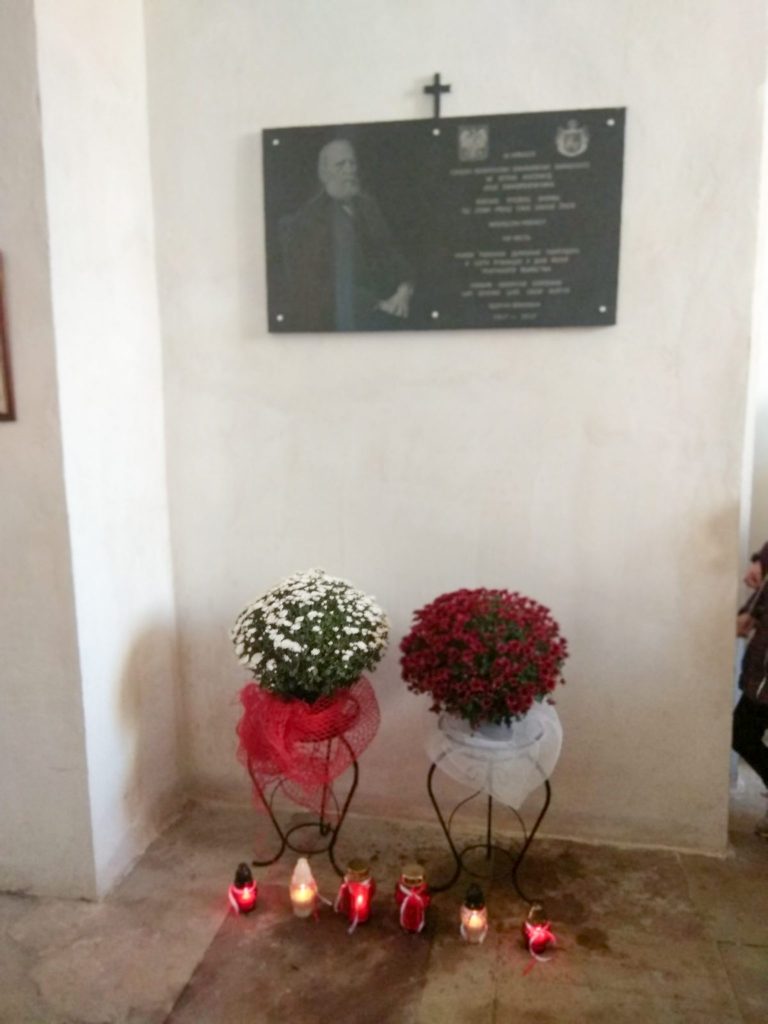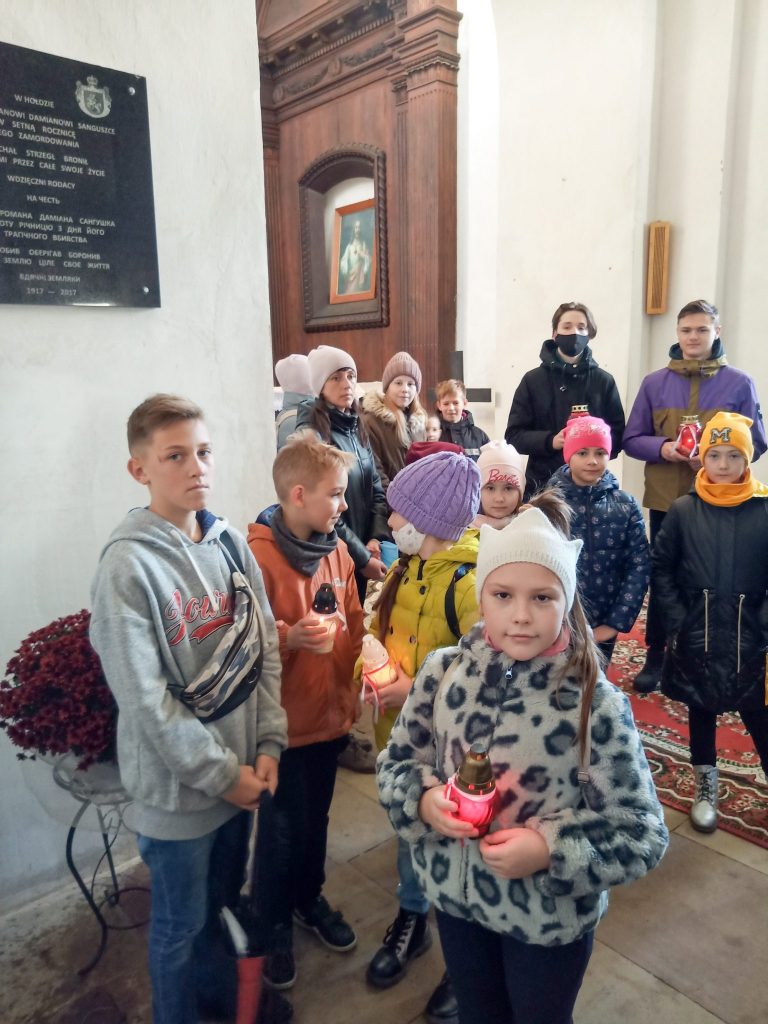 Dalej weszliśmy do kaplicy, gdzie zatrzymaliśmy obok informacji poświęconej śp. Księdzowi Kanonikowi Waleremu Gromadzkiemu – „Apostołowi Syberii”, który zmarł w Sławucie i został pochowany w pobliżu kościoła św. Doroty. Po czym młodzież złożyła kwiaty i zapaliła znicze na mogile śp. Księdza Kanonika Walerego Gromadzkiego.
