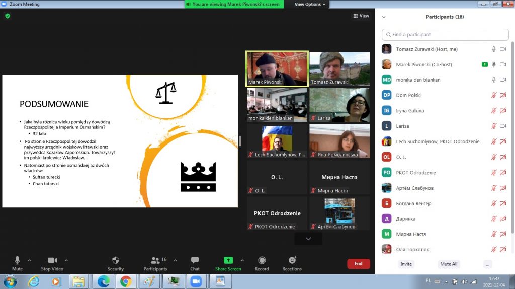 Spotkanie rozpoczęło się od omówienia sytuacji w Europie w wieku XVII (jako że uczestnicy pochodzili zarówno ze wschodu, jak i zachodu Europy) oraz różnic między Rzeczypospolitą a pozostałymi krajami. Scharakteryzowany został sposób sprawowania władzy, łączący zarówno elementy monarchii, jak i republiki. Następnie przedstawiono ówczesne relacje Polski z sąsiadami. W tym kontekście przedstawiono historię pogarszających się (z powodu działalności Kozaków i Tatarów) stosunków z Imperium Osmańskim. Przedstawiono charakterystykę naszego przeciwnika, a także jego armii. Przedstawiono armię Rzeczypospolitej i charakterystykę poszczególnych formacji piechoty i jazdy. Omówiono wydarzenia na wojnie w roku 1620, a także przygotowania do bitwy w roku 1621. Ostatecznie przedstawiono, jak wyglądały działania zbrojne pod samym Chocimiem, a także jak wyglądała praca dyplomacji, która ostatecznie doprowadziła do zakończenia bitwy. W spotkaniu wzięły udział dwie organizacje, część uczestników łączyła się z sali lekcyjnej, część z własnych komputerów.