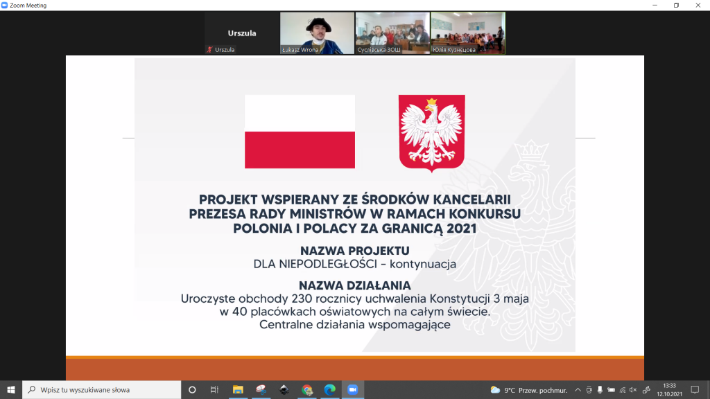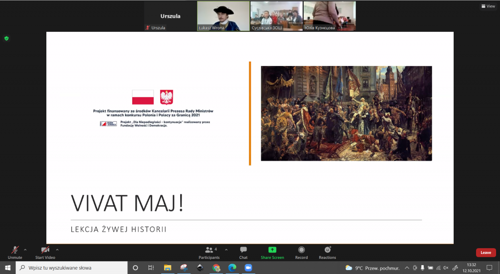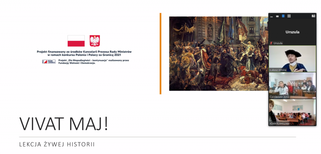 Uczniowie z Marjanowskiego Związku Polaków na Ukrainie i Stowarzyszenia “Polonia Zwiagielszczyzny” w Nowograd Wołyńsku 12 października 2021 uczestniczyli w on-line lekcji „żywej historii” „VIVAT MAJ” z okazji obchodów 230. rocznicy uchwalenia Konstytucji 3 Maja