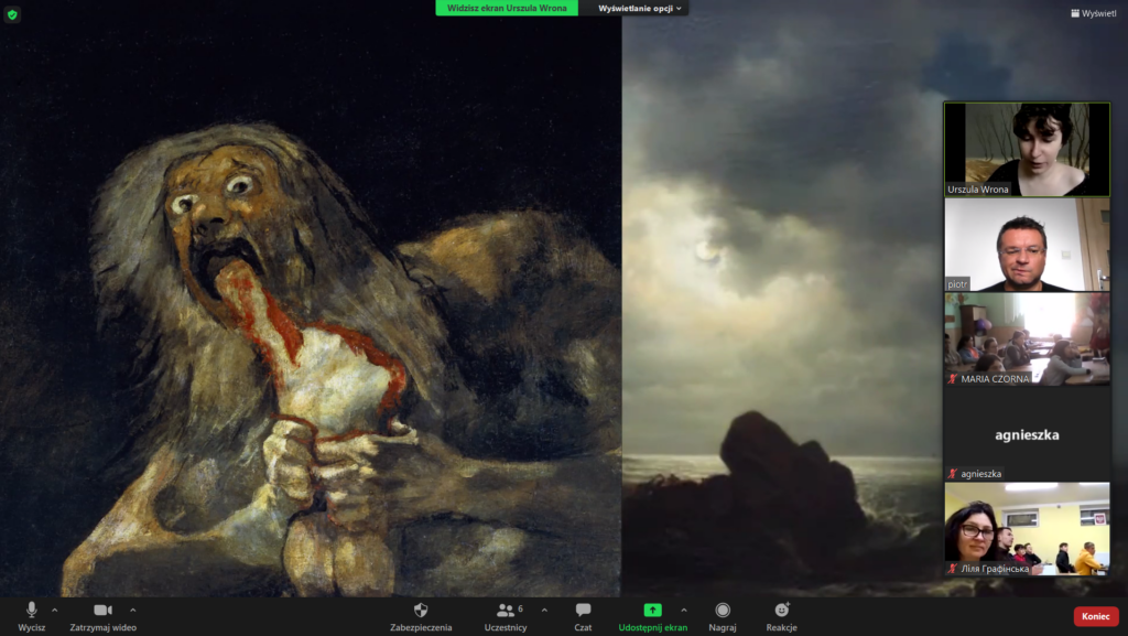 Lekcja miała na celu wyjaśnienie uczestnikom, dzieciom i młodzieży polskiego pochodzenia z Ukrainy, dlaczego w tym roku w Polsce obchodzony jest Rok Romantyzmu Polskiego. Aby to uczynić zaczęliśmy od wyjaśnienia, czym w ogóle był romantyzm. W tym celu zaprezentowaliśmy ogólnie znane skojarzenia i elementy kultury, których początki doszukiwać się możemy w twórczości romantyków. Odwołaliśmy się więc do filmów grozy, fantasy, komedii romantycznych i popularności podróżniczych vlogerów. Tropy te poruszane były bowiem przez artystów XIX wieku. W tej części zaprezentowaliśmy też fragment zarejestrowanego przedstawienia “Dziadów” aby omówić charakterystyczny nastrój grozy i tajemniczości. Zaprezentowany był także ogólnodostępny utwór “Stepy Akermańskie”. Uczestnicy po wysłuchaniu go musieli odpowiedzieć na kilka pytań.
