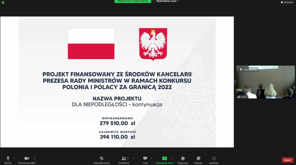 W dniu 03. sierpnia 2022 odbyła się kolejna lekcja z cyklu “Naftowa niepodległość” w ramach projektu “Dla Niepodległości – kontynuacja” . Projekt finansowany ze środków Kancelarii Prezesa Rady Ministrów w ramach konkursu Polonia i Polacy za Granicą 2022. W lekcji uczestniczyli uczniowie z organizacji polonijnych z ośrodka Kultury i Tradycji Polskich w Żytomierzu i organizacji społecznej “Studencki Klub Polski”. W zajęciach uczestniczyło 20 uczniów, którzy połączyły się zdalnie za pośrednictwem ZOOM.