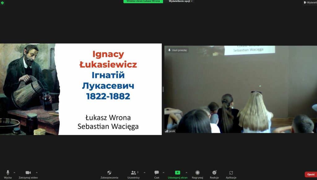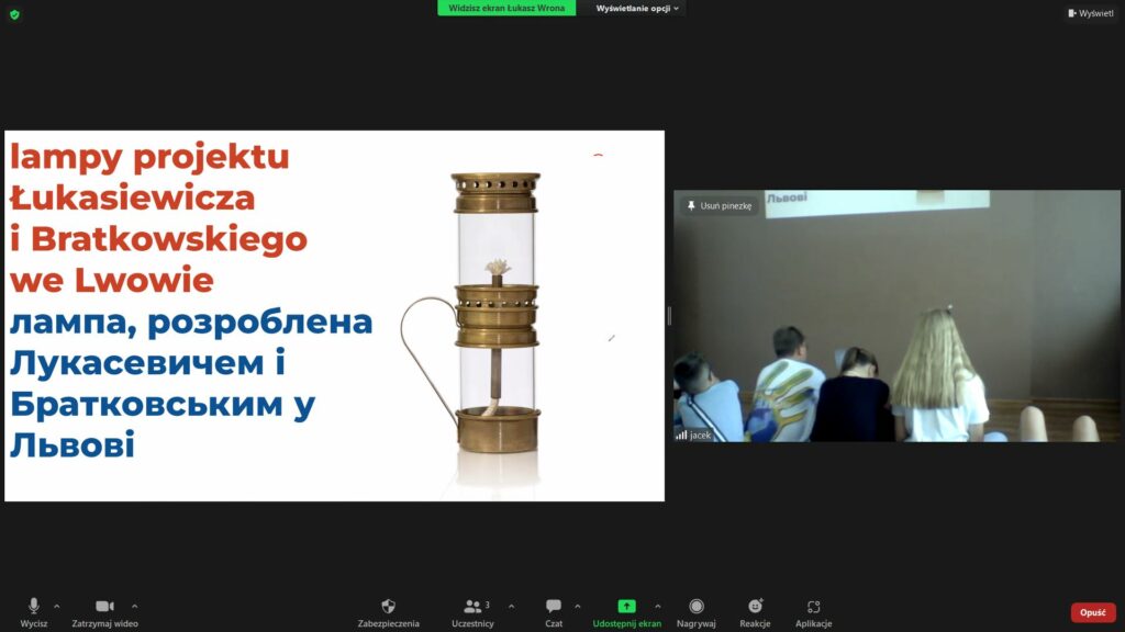 Zgromadzonym na zajęciach przedstawiony został tytuł projektu oraz temat lekcji. Ta zaś rozpoczęła się od dyskusji i burzy mózgów poświęconej znaczeniu światła i ciepła w historii człowieka. Następnie uczestnicy oceniali kolejne wynalazki źródeł światła – ogniska, lampki olejne, świeczki. Na tle przywołanych problemów i bolączek została ukazana praca Łukasiewicza. Aby wzbudzić większe zainteresowanie uczestników z Ukrainy więcej czasu poświęcono jego lwowskiemu okresowi życia. Wykorzystując Google Street View odszukaliśmy miejsca z nim związane (m.in. Aptekę pod Złotą Gwiazdą oraz Szpital Powszechny, w którym dokonano pierwszej nocnej operacji z wykorzystaniem lamp naftowych). Aby zilustrować pracę kopalni ropy naftowej wyemitowany został fragment filmu fabularnego “Aż poleje się krew”. Spotkanie zakończyła kolejna dyskusja na temat filantropi i pomagania innym.