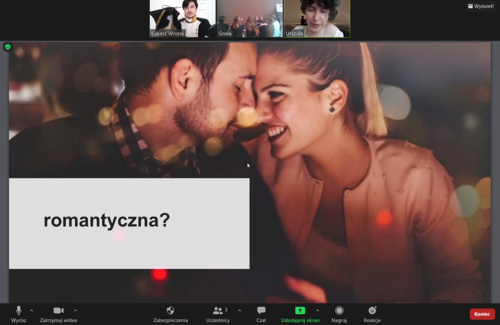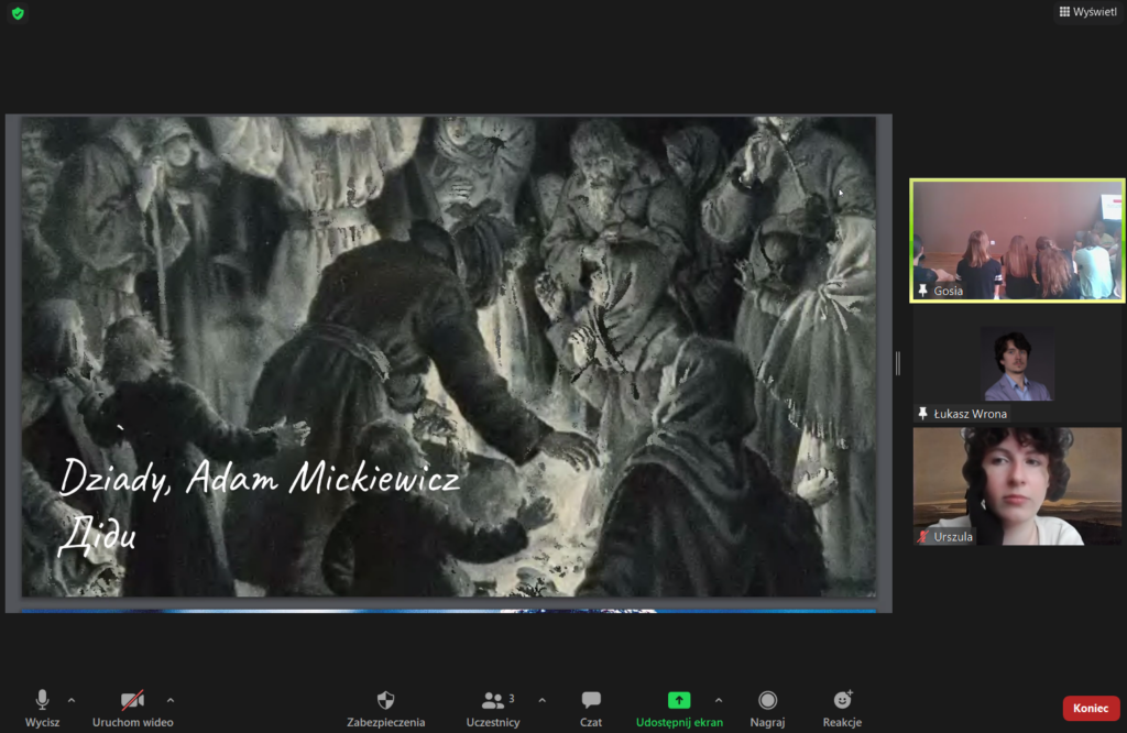 Lekcja została przeprowadzona dla uczestników obozu organizowanego w Polsce (okolice Kłodzka). Wszyscy zgromadzeni byli na sali i uczestniczyli w spotkaniu za pośrednictwem platformy ZOOM. Poinformowani zostali o temacie lekcji. Spotkanie rozpoczęło się od burzy mózgów poświęconej wpływowi romantyków na współczesną kulturę i popkulturę (filmy grozy, filmy fantasy, komedie romantyczne, vlogi podróżnicze). Każdy z ww. przykładów ilustrowany był opowieścią z przeszłości, fragmentem utworu czy sylwetką romantycznego pisarza. Oprócz polskich romantyków przywołany został Taras Szewczenko, bardzo dobrze znany odbiorcom. W trakcie lekcji wykorzystano fragmenty filmowe i muzyczne. Zaprezentowano m.in. fragment zarejestrowanego spektaklu “Dziady”. Omówiono także “Stepy Akermańskie” w nowoczesnej aranżacji Andrzeja Stasiuka i ukraińskiego zespołu “Haydamaky”. W drugiej części spotkania omówiony został wpływ romantyków na upowszechnienie polskiej tradycji narodowej i walk o niepodległość. Wykorzystano fragmenty utworów Mickiewicza, Norwida czy Ujejskiego. Podczas omawiania historii Polski w epoce napoleońskiej wykorzystano repliki mundurowe, w tym wyposażenie żołnierza piechoty Księstwa Warszawskiego. Dokładnie takiego, jakie mógł widzieć na własne oczy młody Adam Mickiewicz w 1812 roku.