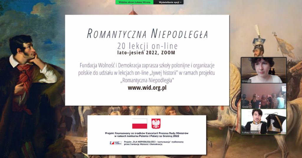 W dniu 04. sierpnia 2022 odbyła się kolejna lekcja z cyklu “Romantyczna Niepodległa” w ramach projektu “Dla Niepodległości – kontynuacja“. Projekt finansowany ze środków Kancelarii Prezesa Rady Ministrów w ramach konkursu Polonia i Polacy za Granicą 2022. W lekcji uczestniczyli uczniowie z organizacji polonijnych z ośrodka Kultury i Tradycji Polskich w Żytomierzu i organizacji społecznej “Studencki Klub Polski”. W zajęciach uczestniczyło 20 uczniów, którzy połączyły się zdalnie za pośrednictwem Zoom.