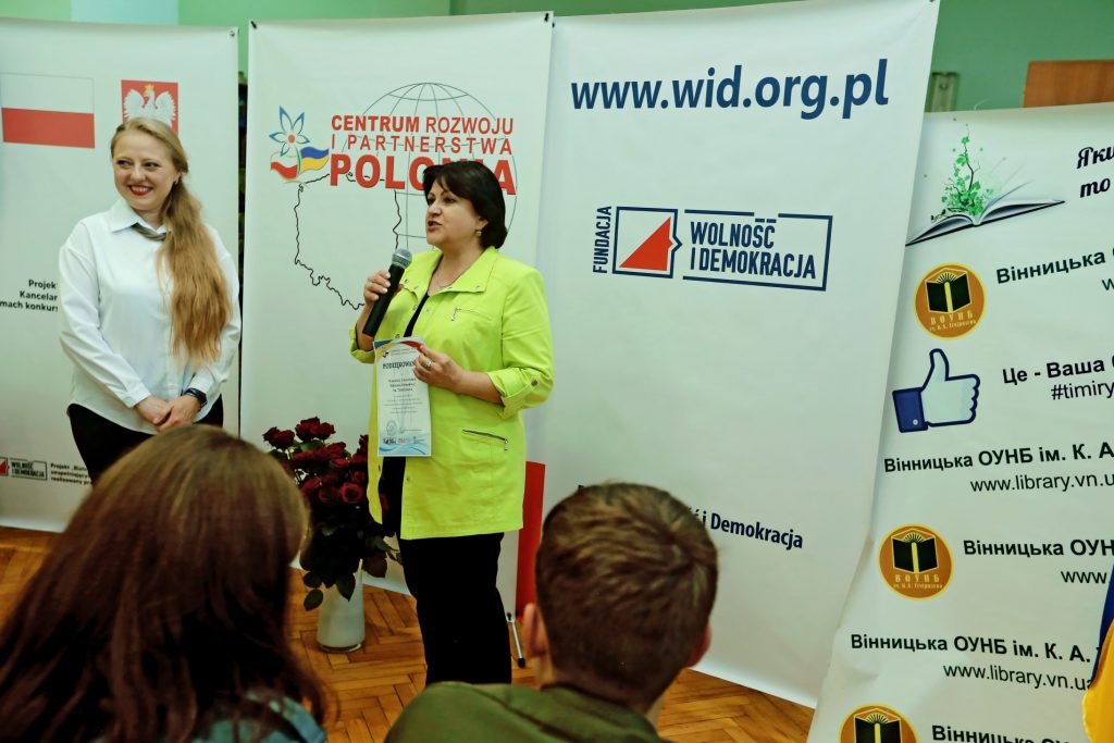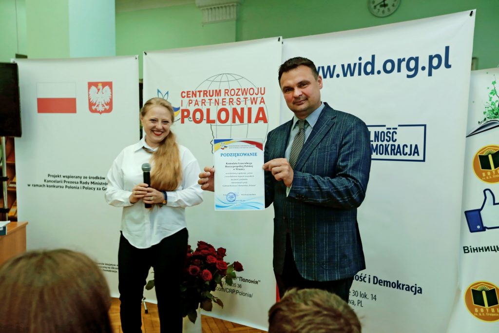 Zostały również wręczone podziękowania dla naszych partnerów we współpracy z którymi przeprowadziliśmy wiele ciekawych projektów. Na nasze święto przybyli więc dyrektor WOUNB im. Timiriazewa – pani Larysa Senyk, prorektor Winnickiego Narodowego Uniwersytetu Technicznego – pani Switłana Denysiuk, prorektor Winnickiego Państwowego Uniwersytetu Pedagogicznego – pan Sergiusz Zagorodnij. Specjalne podziękowania składamy dla Konsulatu Generalnego RP w Winnicy i Fundacji Wolność i Demokracja za współpracę, pomoc i ogromne wsparcie podczas naszej działalności śródrocznej oraz przy organizacji projektów polonijnych realizowanych przez naszą organizację.