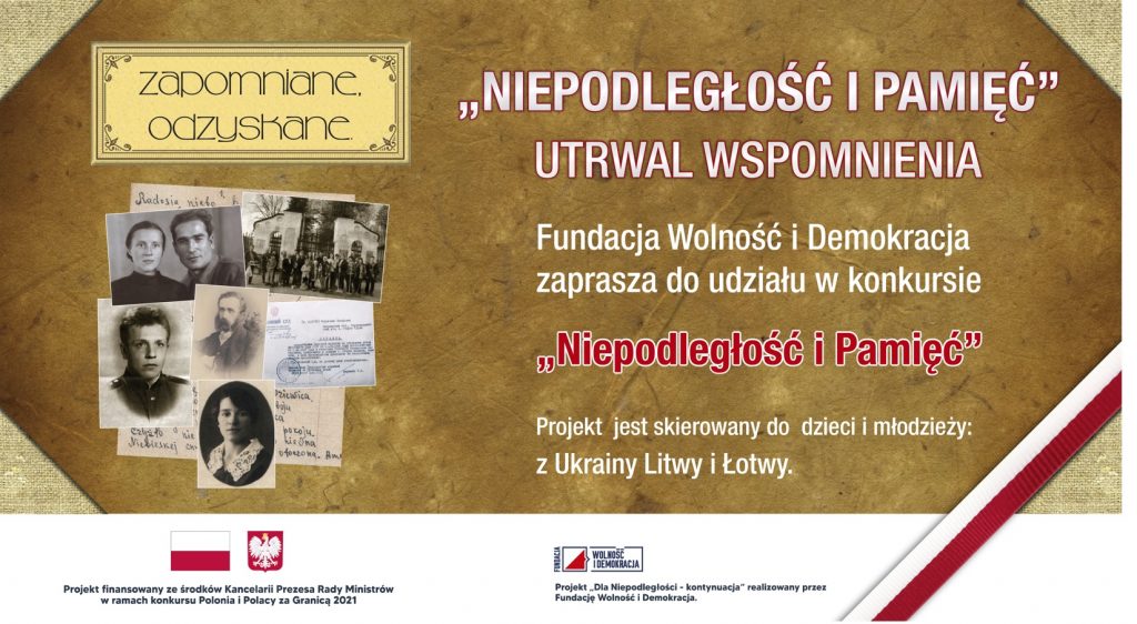 Konkurs “Niepodległość i Pamięć” jest realizowany przez Fundację Wolność i Demokracja w ramach projektu “DLA NIEPODLEGŁOŚCI – kontynuacja”.