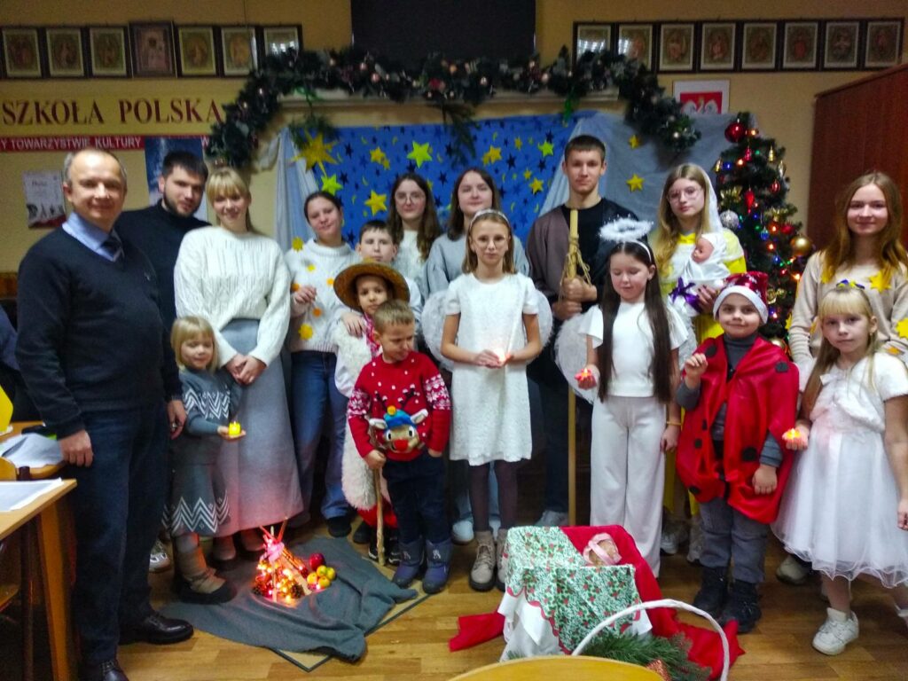 Sala szkolna miała wystrój świąteczny, było niebo z gwiazdami, paliły się świeczki, co dodało ciepła temu wydarzeniu. Prezes TKP w Kowlu złożył uczniom, rodzicom i członkom towarzystwa życzenia spokojnych świąt Bożego Narodzenia i wszelakiego dobra w nowym 2025 roku.