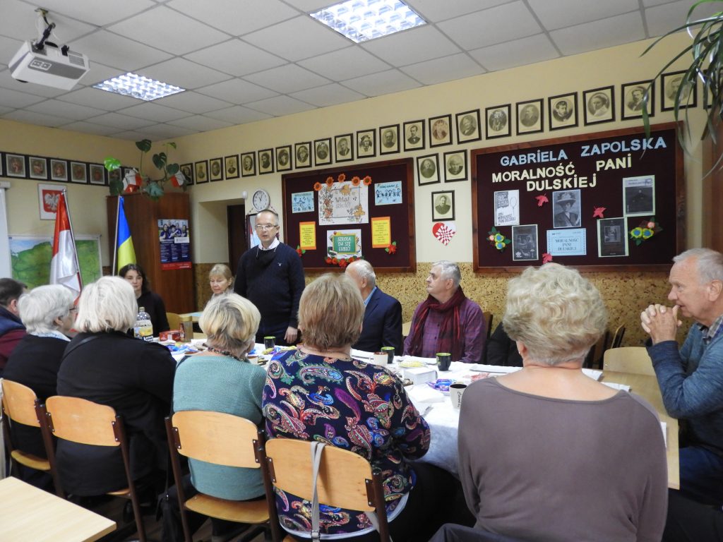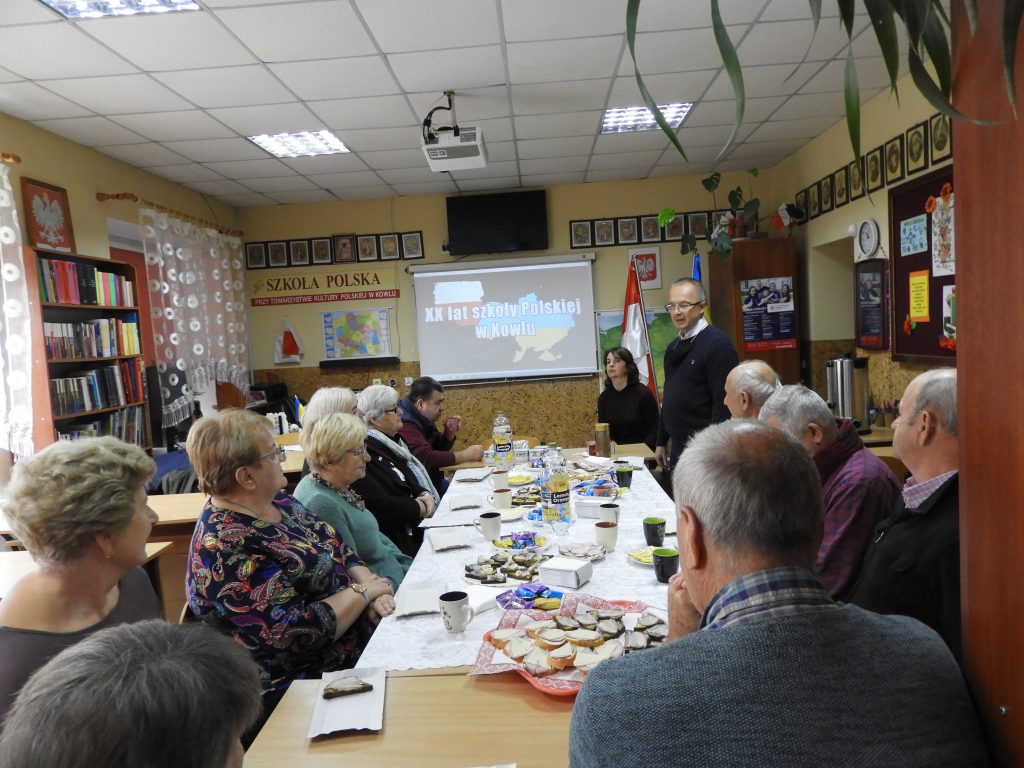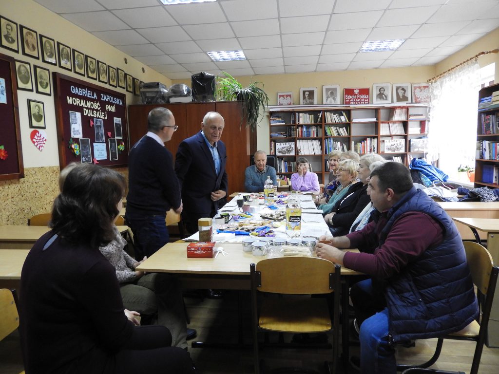 Potem delegaci spotkali się z prezesem Anatolem Herką i członkami towarzystwa w sali szkoły. Uczniom przekazali tablice ortograficzne oraz atlasy Polski. Uczestnicy spotkania obejrzeli film o XX – leciu szkoły i zdjęcia z różnych okresów działalności szkoły. Mogli też wysłuchać wspomnień byłych uczniów.