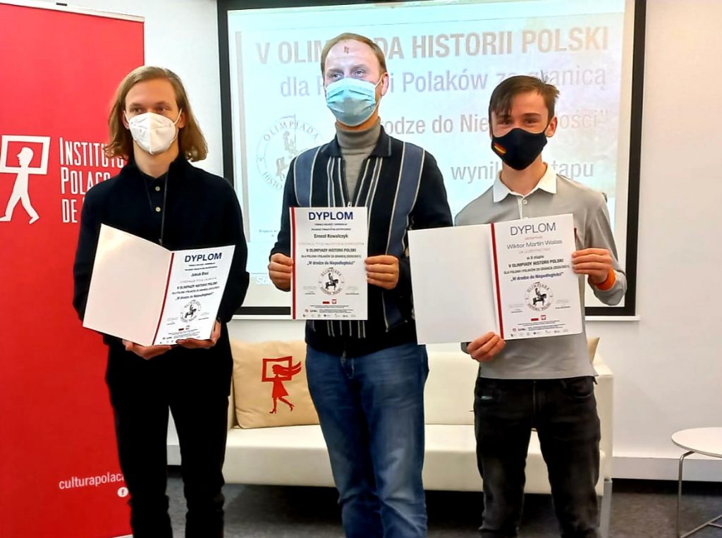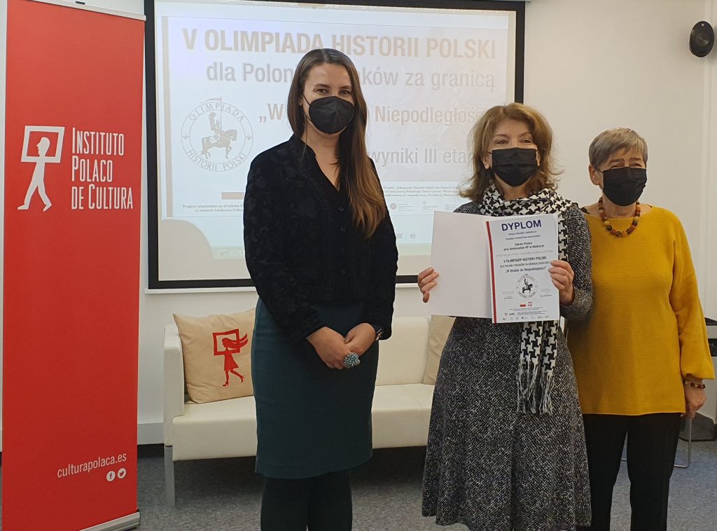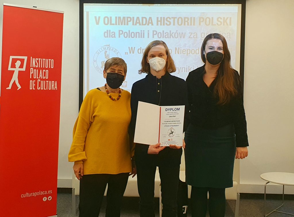 W piątek 17 grudnia w siedzibie Instytutu Polskiego w Madrycie odbyło się wręczenie dyplomów i nagród hiszpańskim uczestnikom V Olimpiady Historii Polski dla Polonii i Polaków za granicą. W uroczystości wzięły udział dyrektor Instytutu Polskiego w Madrycie Mirosława Kubas-Paradowska oraz konsul Rzeczypospolitej Polskiej w Madrycie Ilona Hahn, które wręczyły wyróżnionym dyplomy oraz nagrody. Instytut Polski w Madrycie postanowił dodatkowo uhonorować obu olimpijczyków z Hiszpanii i przygotował dla każdego z nich zestaw książek.