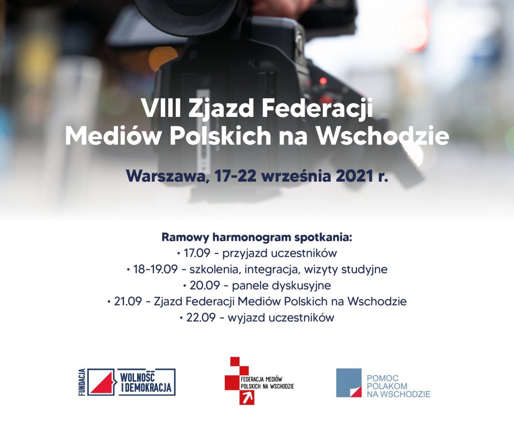 Serdecznie zapraszamy przedstawicieli redakcji mediów polskich na VIII Zjazd Federacji Mediów Polskich na Wschodzie. Zjazd odbędzie się 21 września w Warszawie (dokładne miejsce zostanie podane niebawem). Zjazd zostanie poprzedzony cyklem szkoleń i warsztatów, na które również serdecznie zapraszamy.