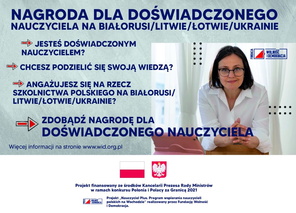 Nagroda dla Doświadczonego Nauczyciela – Program Nagrody finansowej skierowany do nauczycieli doświadczonych realizowany przez Fundację Wolność i Demokracja w celu wspierania rozwoju polskojęzycznego szkolnictwa stacjonarnego i społecznego na Wschodzie. Nagroda dla Doświadczonego Nauczyciela jest realizowana w ramach projektu „Nauczyciel PLUS”. Program wspierania nauczycieli polskich na Wschodzie”.